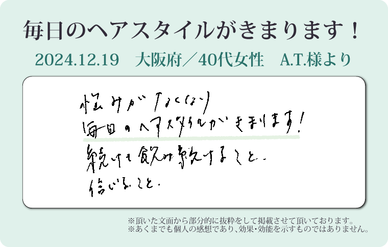 「悩みがなくなり、毎日のヘアスタイルが決まる」とのお声に、日々の積み重ねの大切さを感じます。